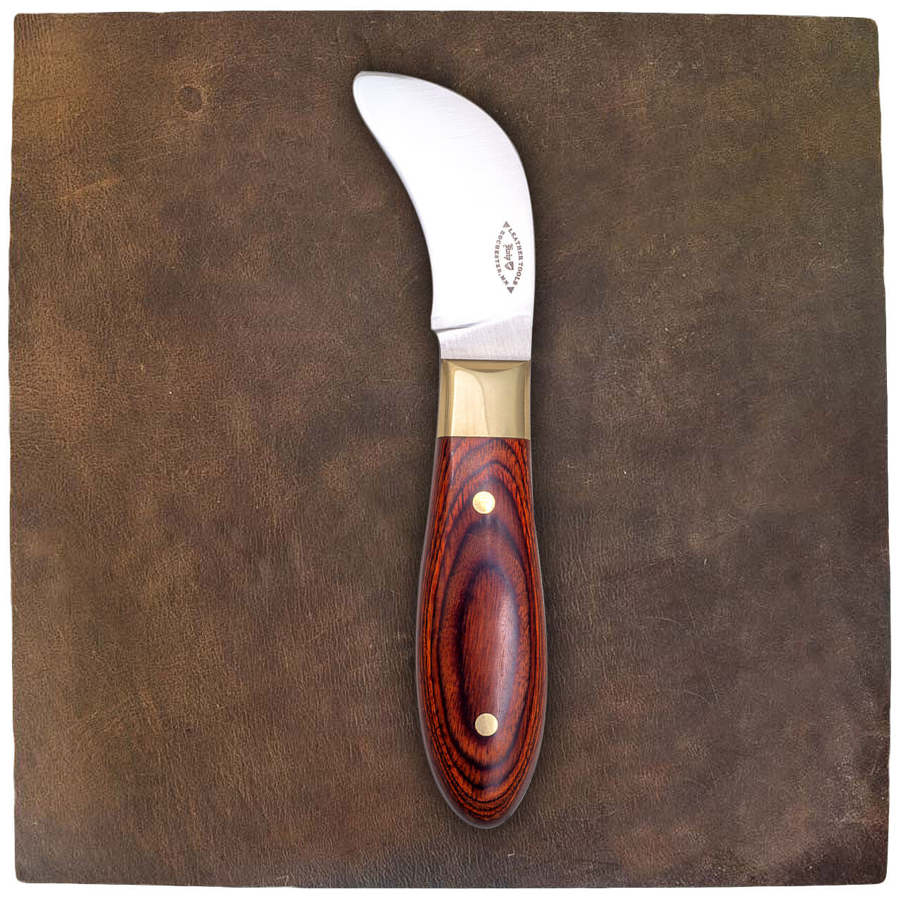 A shape commisioned by Johan Potgieter. I liked it and added it to the line. Blade is for making pull or draw cuts in leather and has a recurved rounded point that won’t dig into the cutting board. 6 3/4″ long, 1″ wide with a 2 3/4″ blade. 154-CM Steel, RC-61 hardness.